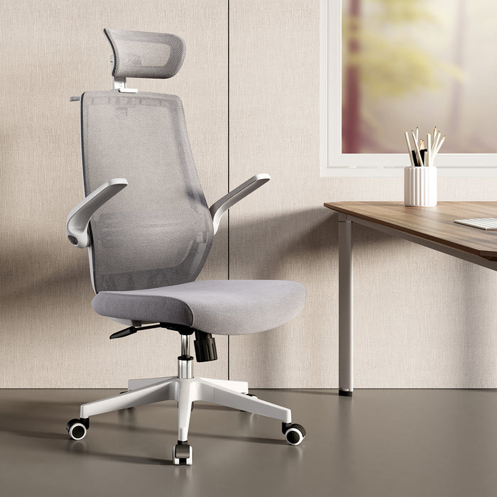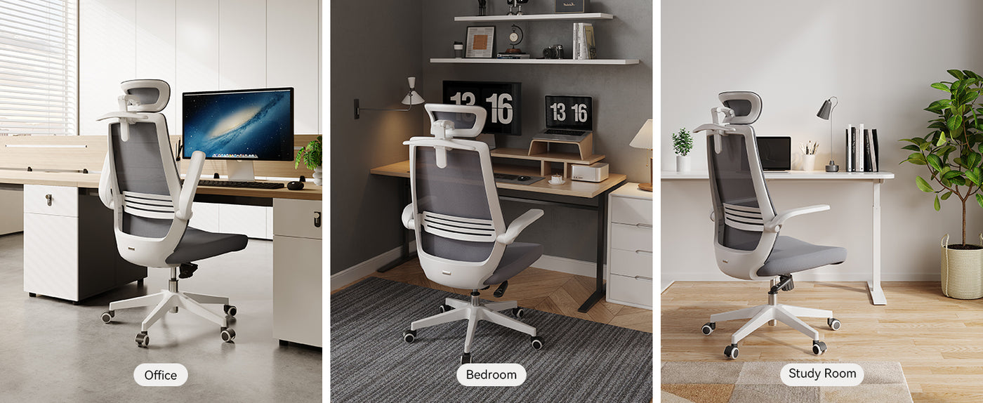 Materials: ‎Polyester three-proof mesh, PP+fiber movable armrests, PP+fiber back basket, mute and non-slip white edge PU chair wheels, single handle thickened explosion-proof mechanism